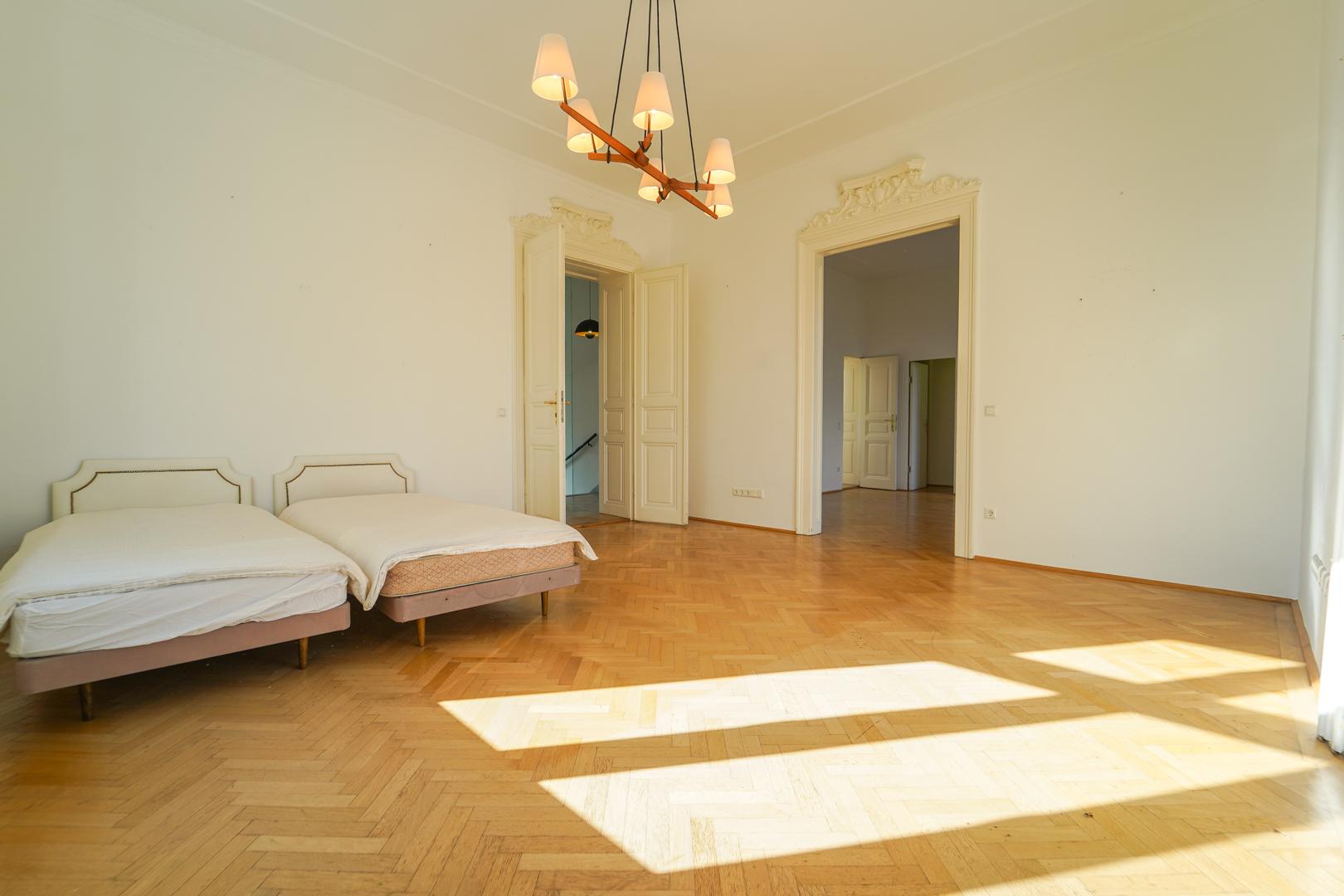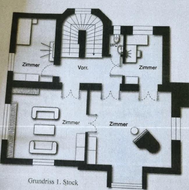 – 1. Stockwerk: WC, 2 kleinere Zimmer, 2 größere miteinander verbundene Zimmer