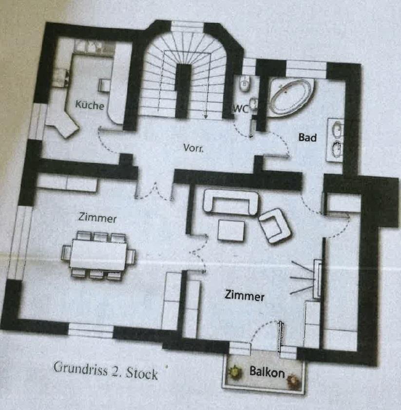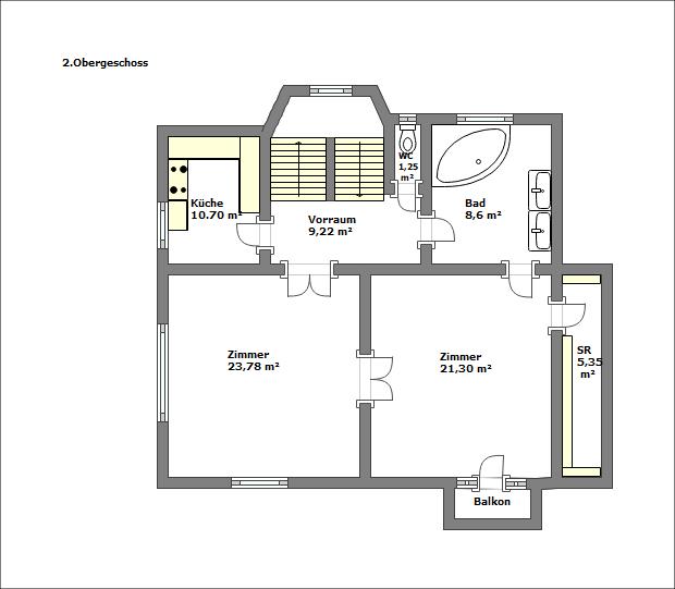 – 2. Stockwerk: WC, Bad mit Wanne, Küche, 2 miteinander verbundene Zimmer, Balkon